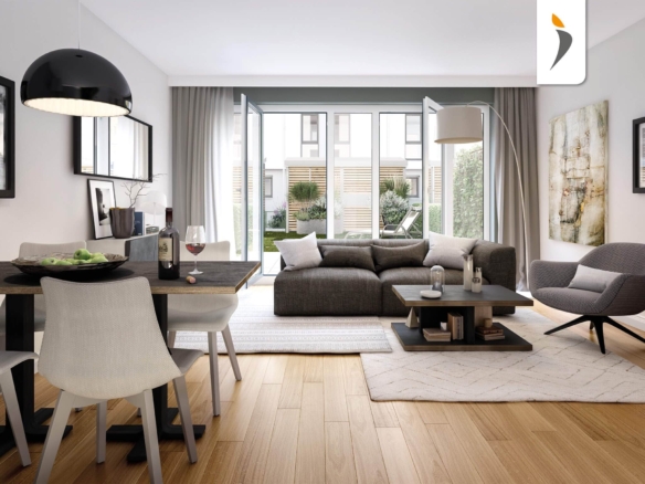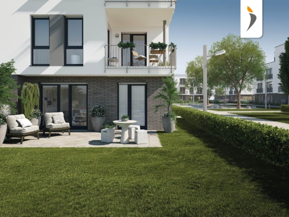 Im Rahmen eines vom Stadtentwicklungsausschuss ausgeschriebenen Gutachterverfahrens ging das Konzept von ASPELOHE als Siegerentwurf hervor. Rund um einen zentralen Quartiersplatz entstehen Townhäuser und Eigentumswohnungen mit Garten, Balkon, Loggia oder Dachterrasse. Die Wohnflächen sind vielfältig und zum Teil barrierefrei gestaltet. In großzügige Grünflächen eingebettet, wohnen Sie hier in einem von Offenheit geprägten Ensemble mit Tiefgarage und Außenstellplätzen.